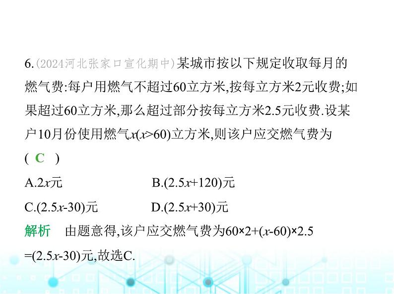 6.(2024河北张家口宣化期中)某城市按以下规定收取每月的 燃气费:每户用燃气不超过60立方米,按每立方米2元收费;如 果超过60立方米,那么超过部分按每立方米2.5元收费.设某 户10月份使用燃气x(x>60)立方米,则该户应交燃气费为 ( )A.2x元 B.(2.5x+120)元C.(2.5x-30)元 D.(2.5x+30)元