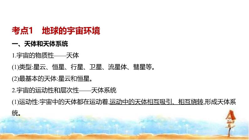 考点1 地球的宇宙环境一、天体和天体系统1.宇宙的物质性——天体(1)类型:星云、恒星、行星、卫星、流星体、彗星等。(2)最基本的天体:星云和恒星。2.宇宙的运动性和层次性——天体系统(1)运动性:宇宙中的天体都在运动着,运动中的天体相互吸引、相互绕转,形成天体系