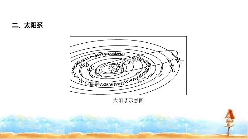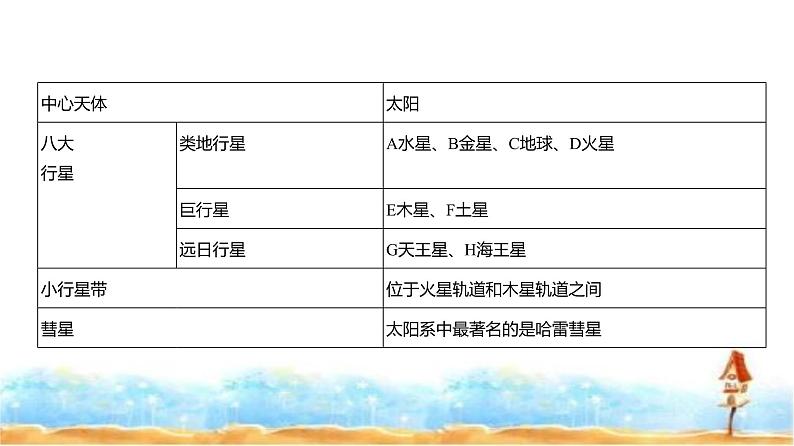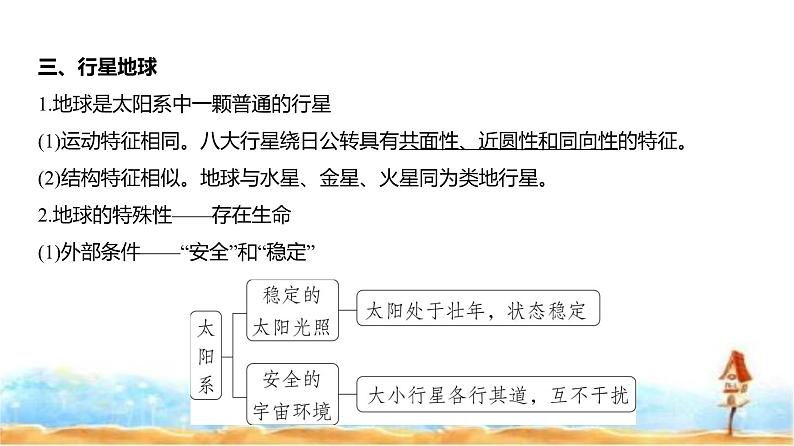 三、行星地球1.地球是太阳系中一颗普通的行星(1)运动特征相同。八大行星绕日公转具有共面性、近圆性和同向性的特征。(2)结构特征相似。地球与水星、金星、火星同为类地行星。2.地球的特殊性——存在生命(1)外部条件——“安全”和“稳定”