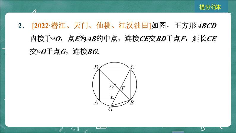 2. [2022·潜江、天门、仙桃、江汉油田]如图,正方形ABCD 内接于⊙O,点E为AB的中点,连接CE交BD于点F,延长CE 交⊙O于点G,连接BG.