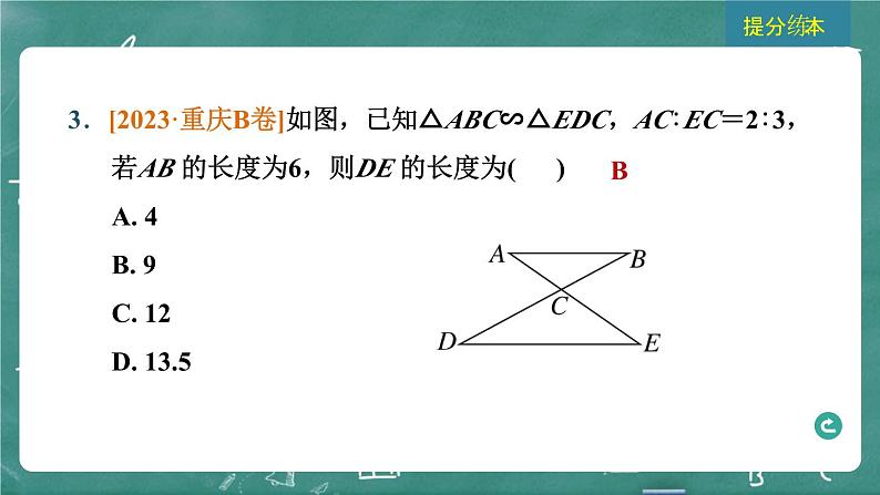 3.[2023·重庆B卷]如图,已知△ABC∽△EDC,AC∶EC=2∶3,若AB 的长度为6,则DE 的长度为( )A. 4 B. 9 C. 12 D. 13.5