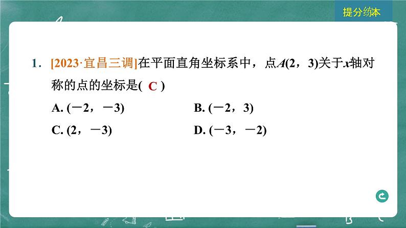 1.[2023·宜昌三调]在平面直角坐标系中,点A(2,3)关于x轴对称的点的坐标是( )A. (-2,-3) B. (-2,3)C. (2,-3) D. (-3,-2)