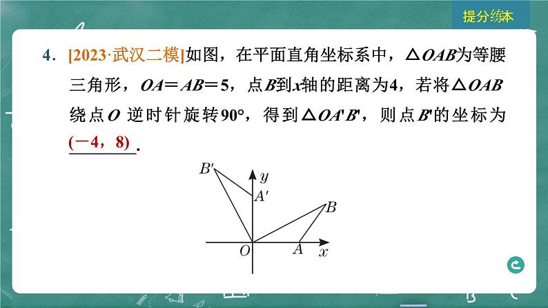4.[2023·武汉二模]如图,在平面直角坐标系中,△OAB为等腰三角形,OA=AB=5,点B到x轴的距离为4,若将△OAB 绕点O 逆时针旋转90°,得到△OA'B',则点B'的坐标为________.