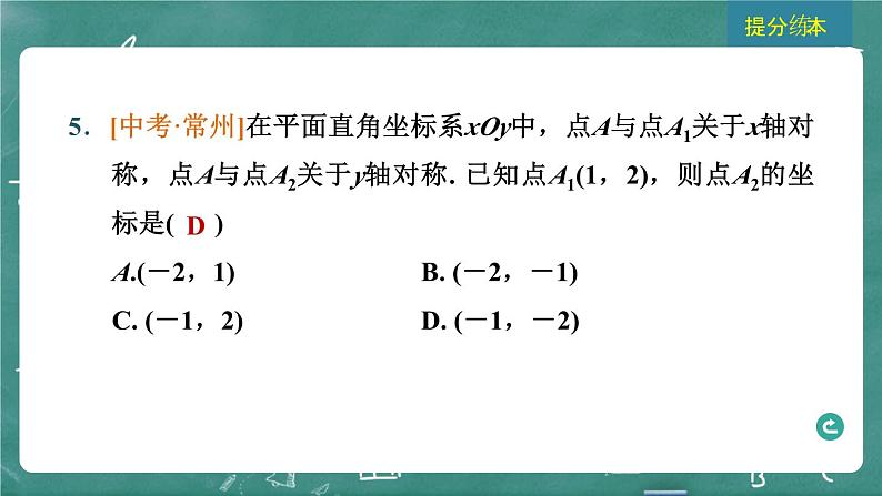 5.[中考·常州]在平面直角坐标系xOy中,点A与点A1关于x轴对称,点A与点A2关于y轴对称. 已知点A1(1,2),则点A2的坐标是( )A.(-2,1) B. (-2,-1)C. (-1,2) D. (-1,-2)