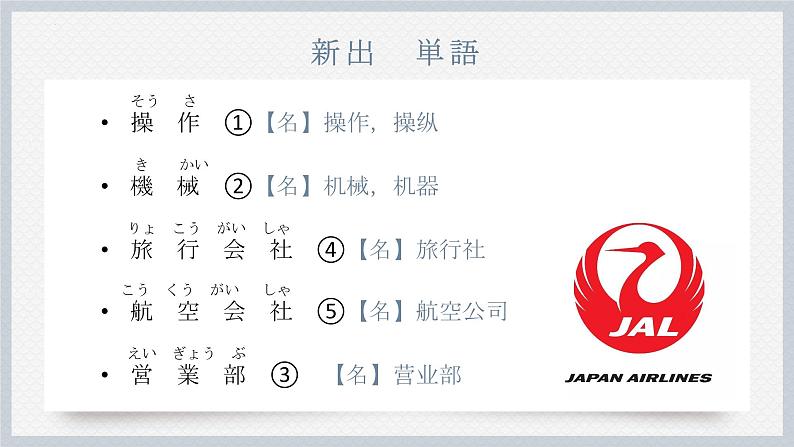 展开そう さ操 作 ①【名】操作,操纵 き かい機 械 ②【名】机械,机器 りょ こう がい しゃ 旅 行 会 社 ④【名】旅行社 こう くう がい しゃ航 空 会 社 ⑤【名】航空公司 えい ぎょう ぶ営 業 部 ③ 【名】营业部
