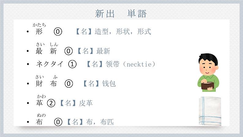 ネクタイ ① 【名】领带(necktie) さい ふ財 布 ⓪ 【名】钱包 かわ 革 ② 【名】皮革 ぬの 布 ⓪ 【名】布,布匹