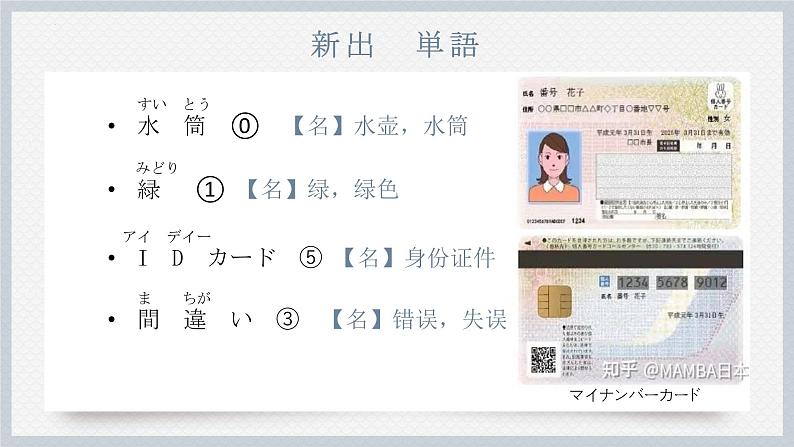 アイ デイーI D カード ⑤ 【名】身份证件 ま ちが間 違 い ③ 【名】错误,失误