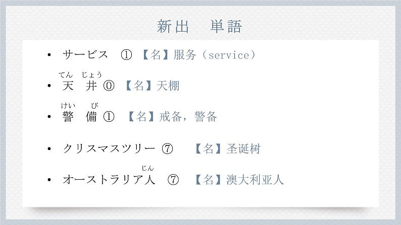 サービス ① 【名】服务(service) てん じょう 天 井 ⓪ 【名】天棚 けい び警 備 ① 【名】戒备,警备 クリスマスツリー ⑦ 【名】圣诞树 じんオーストラリア人 ⑦ 【名】澳大利亚人