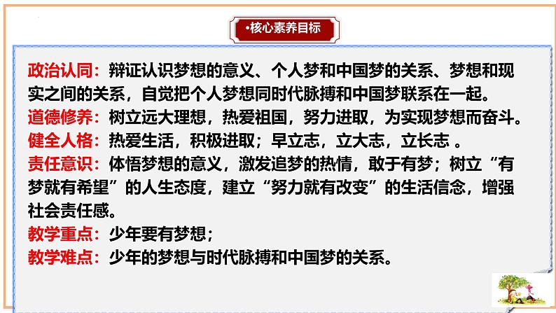 人教版(2024)七年级上册(2024)第一单元 少年有梦第三课 梦想始于当下做有梦想的少年评课课件ppt: 这是一份人教版(2024)七年级上册(2024)<a href="/zz/tb_c4049082_t3/?tag_id=26" target="_blank">第一单元 少年有梦第三课 梦想始于当下做有梦想的少年评课课件ppt</a>,共21页。PPT课件主要包含了核心素养目标,探究梦想的含义,追梦少年,少年梦想的特点,课堂训练等内容,欢迎下载使用。