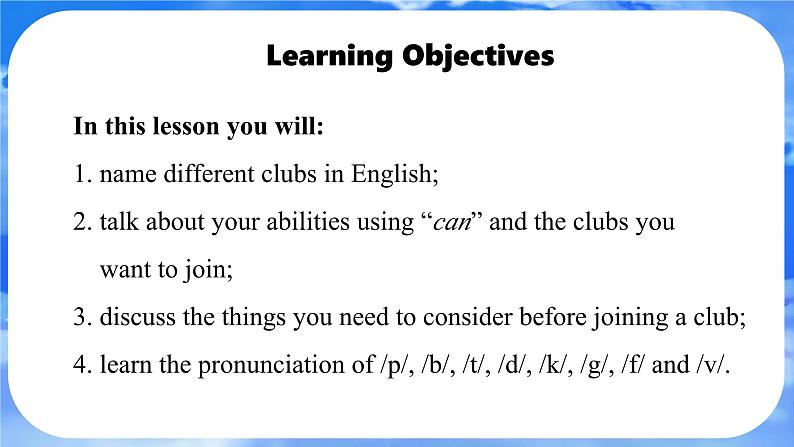 In this lessn yu will:1. name different clubs in English;2. talk abut yur abilities using “can” and the clubs yu want t jin;3. discuss the things yu need t cnsider befre jining a club;4. learn the prnunciatin f /p/, /b/, /t/, /d/, /k/, /g/, /f/ and /v/.