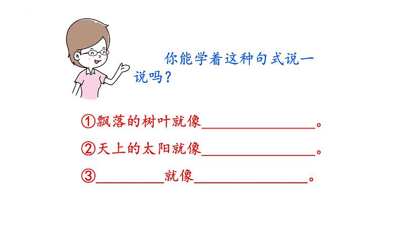 ①飘落的树叶就像_______________。②天上的太阳就像_______________。③_________就像_______________。