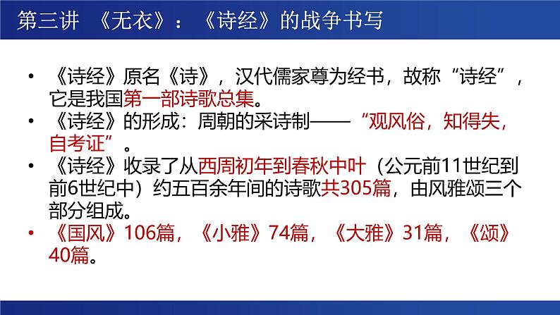 这是一份人教统编版选择性必修 上册无衣教学演示ppt课件,共16页。PPT课件主要包含了《诗经》,《无衣》创作背景等内容,欢迎下载使用。