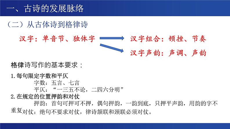 1.每句限定字数和平仄 字数:五言、七言 平仄:“一三五不论,二四六分明”2.在规定的位置押韵和对仗 押韵:首句可押可不押,偶句押韵,一韵到底,只押平声韵,用韵的字不重复