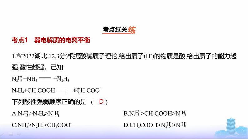 1. (2022湖北,12,3分)根据酸碱质子理论,给出质子(H+)的物质是酸,给出质子的能力越强,酸性越强。已知:N2 +NH3 N +N2H4N2H4+CH3COOH N2 +CH3COO-下列酸性强弱顺序正确的是 ( )A.N2 >N2H4>N B.N2 >CH3COOH>N C.NH3>N2H4>CH3COO-D.CH3COOH>N2 >N