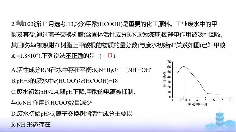 2. (2023浙江1月选考,13,3分)甲酸(HCOOH)是重要的化工原料。工业废水中的甲酸及其盐,通过离子交换树脂(含固体活性成分R3N,R为烷基)因静电作用被吸附回收,