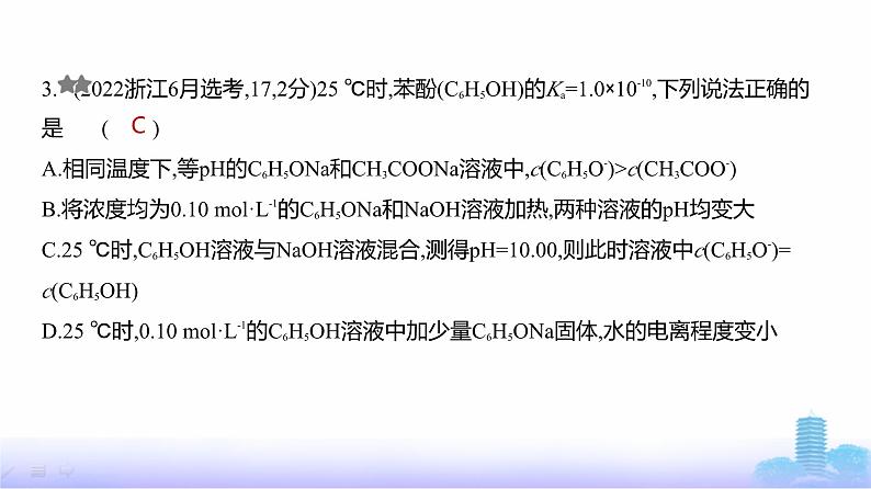 3. (2022浙江6月选考,17,2分)25 ℃时,苯酚(C6H5OH)的Ka=1.0×10-10,下列说法正确的是 ( )A.相同温度下,等pH的C6H5ONa和CH3COONa溶液中,c(C6H5O-)>c(CH3COO-)B.将浓度均为0.10 ml·L-1的C6H5ONa和NaOH溶液加热,两种溶液的pH均变大C.25 ℃时,C6H5OH溶液与NaOH溶液混合,测得pH=10.00,则此时溶液中c(C6H5O-)=c(C6H5OH)D.25 ℃时,0.10 ml·L-1的C6H5OH溶液中加少量C6H5ONa固体,水的电离程度变小