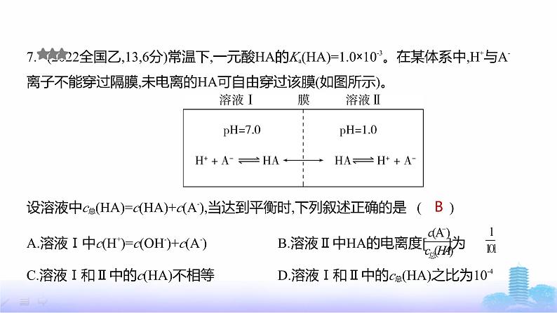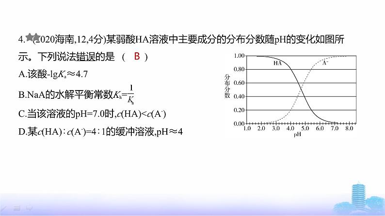 4. (2020海南,12,4分)某弱酸HA溶液中主要成分的分布分数随pH的变化如图所示。下列说法错误的是 ( )A.该酸-lgKa≈4.7