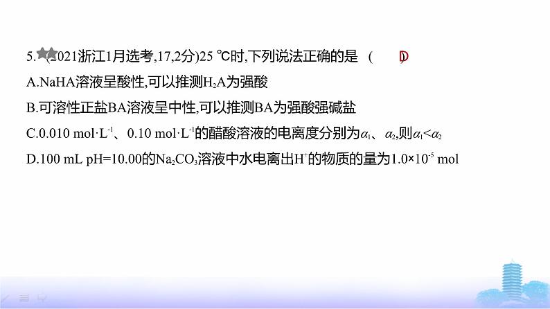 3. (2023金丽衢十二校一模,14)下列说法一定正确的是 ( )A.相同温度下,1 L 0.02 ml·L-1的NaCl溶液和2 L 0.01 ml·L-1 NaCN溶液中的离子总数