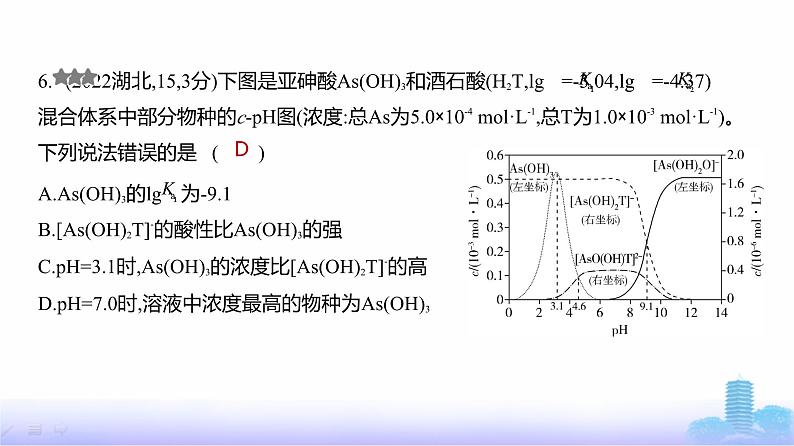 8. (2023湖北,14,3分)H2L为某邻苯二酚类配体,其p =7.46,p =12.4。常温下构建Fe(Ⅲ)-H2L溶液体系,其中c0(Fe3+)=2.0×10-4ml·L-1,c0(H2L)=5.0×10-3 ml·L-1。体系中含
