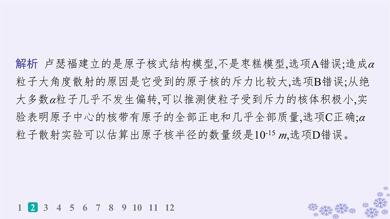 解析 卢瑟福建立的是原子核式结构模型,不是枣糕模型,选项A错误;造成α粒子大角度散射的原因是它受到的原子核的斥力比较大,选项B错误;从绝大多数α粒子几乎不发生偏转,可以推测使粒子受到斥力的核体积极小,实验表明原子中心的核带有原子的全部正电和几乎全部质量,选项C正确;α粒子散射实验可以估算出原子核半径的数量级是10-15 m,选项D错误。