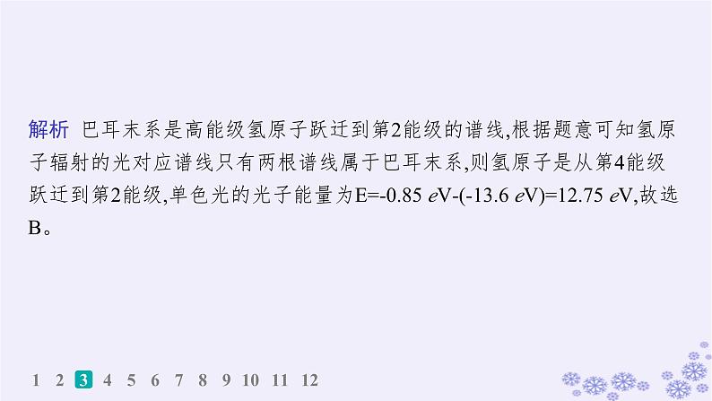 解析 巴耳末系是高能级氢原子跃迁到第2能级的谱线,根据题意可知氢原子辐射的光对应谱线只有两根谱线属于巴耳末系,则氢原子是从第4能级跃迁到第2能级,单色光的光子能量为E=-0.85 eV-(-13.6 eV)=12.75 eV,故选B。
