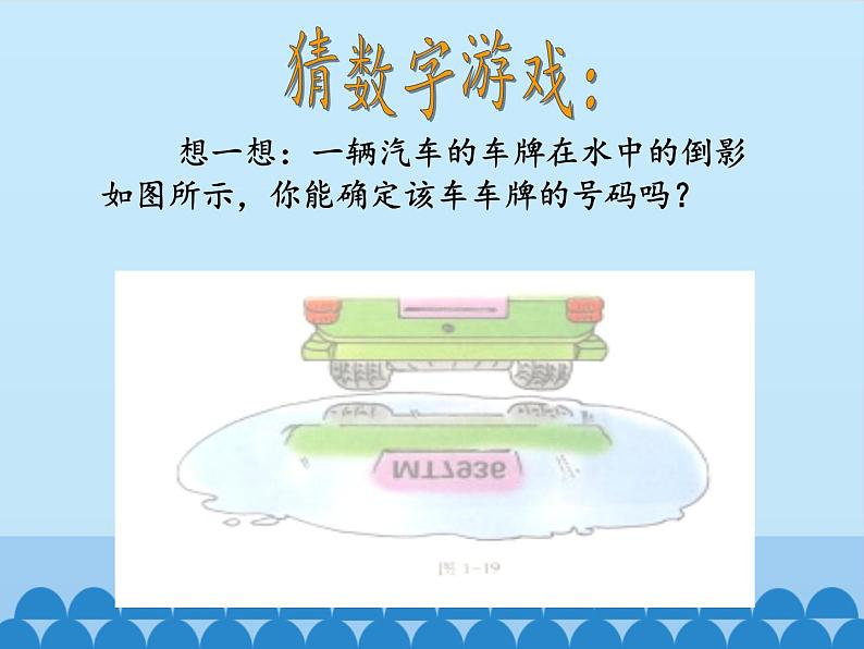想一想:一辆汽车的车牌在水中的倒影如图所示,你能确定该车车牌的号码吗?