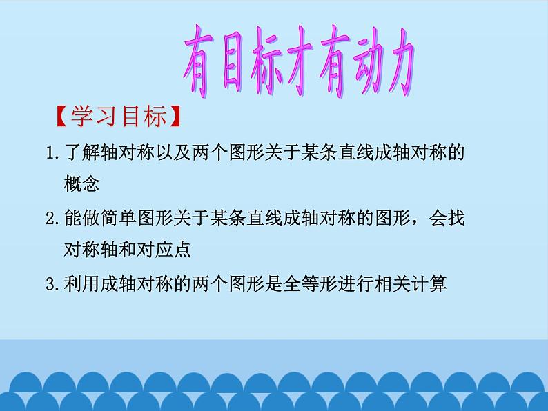 【学习目标】1.了解轴对称以及两个图形关于某条直线成轴对称的 概念2.能做简单图形关于某条直线成轴对称的图形,会找 对称轴和对应点3.利用成轴对称的两个图形是全等形进行相关计算