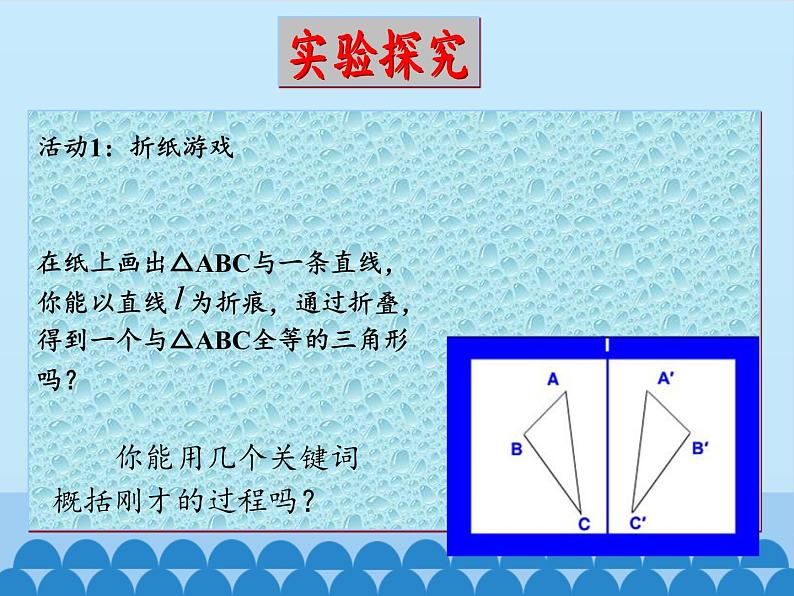 活动1:折纸游戏在纸上画出△ABC与一条直线,你能以直线 为折痕,通过折叠,得到一个与△ABC全等的三角形吗? 你能用几个关键词 概括刚才的过程吗?