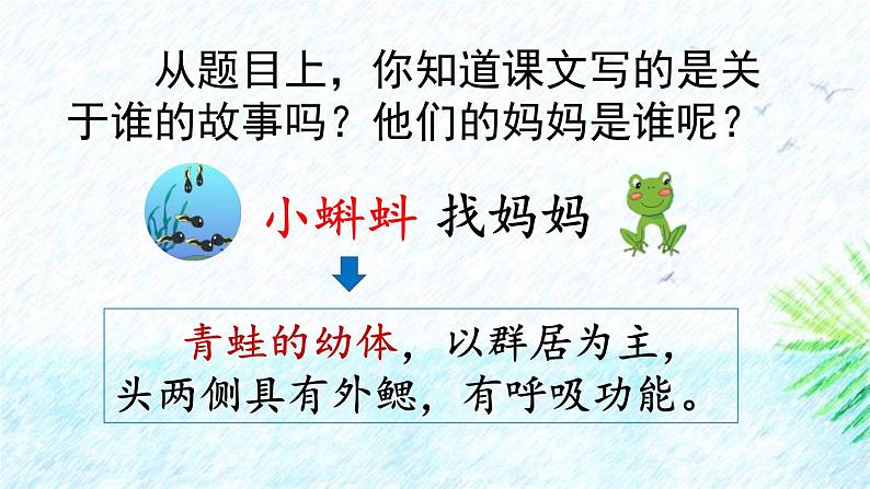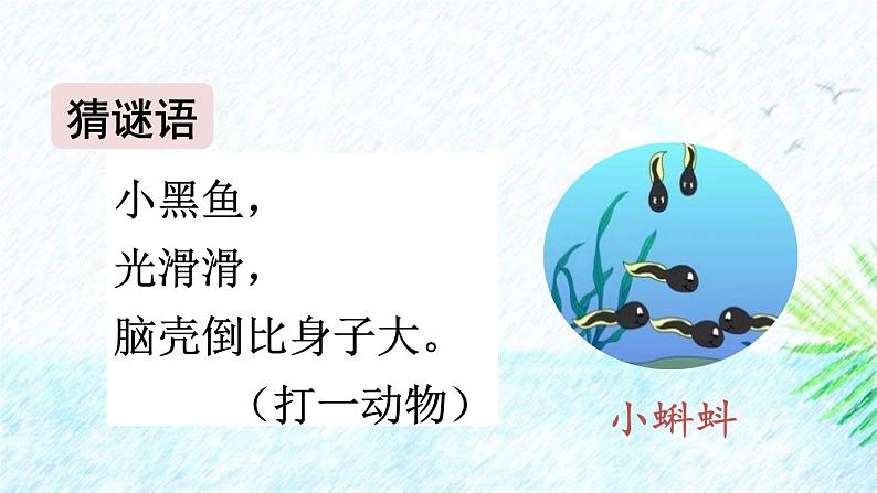 小学语文人教部编版二年级上册小蝌蚪找妈妈授课课件ppt: 这是一份小学语文人教部编版二年级上册<a href="/yw/tb_c132962_t3/?tag_id=26" target="_blank">小蝌蚪找妈妈授课课件ppt</a>,共10页。