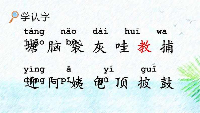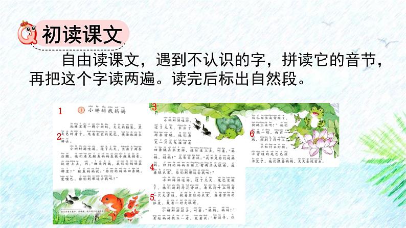 小学语文人教部编版二年级上册小蝌蚪找妈妈课文配套ppt课件: 这是一份小学语文人教部编版二年级上册<a href="/yw/tb_c132962_t3/?tag_id=26" target="_blank">小蝌蚪找妈妈课文配套ppt课件</a>,共18页。PPT课件主要包含了情景导入,图片感知,初识生字,练读词语,学习生字,初读课文,研读课文,游来游,四条腿宽嘴巴,追上去等内容,欢迎下载使用。