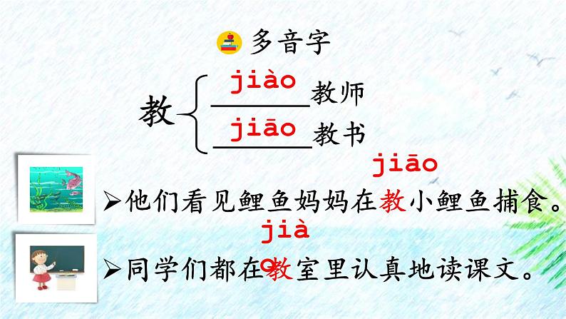 他们看见鲤鱼妈妈在教小鲤鱼捕食。同学们都在教室里认真地读课文。
