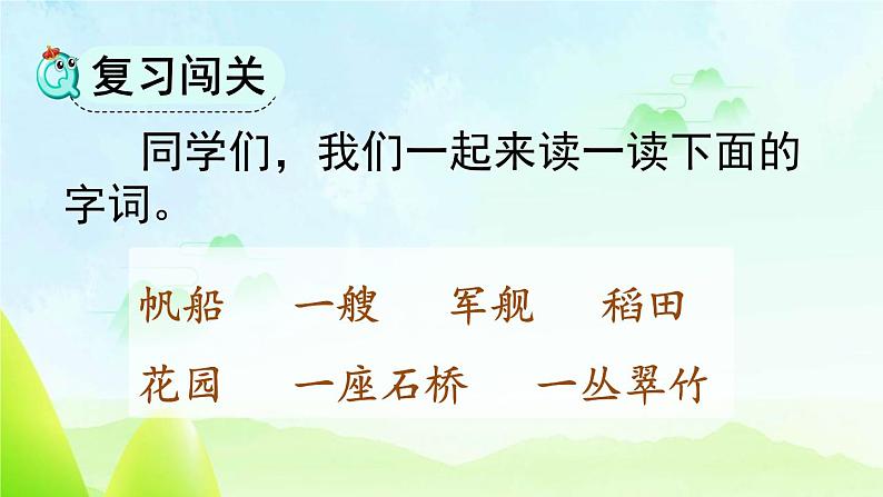 语文二年级上册场景歌课文课件ppt: 这是一份语文二年级上册<a href="/yw/tb_c132969_t3/?tag_id=26" target="_blank">场景歌课文课件ppt</a>,共9页。PPT课件主要包含了一群飞鸟,一座石桥,一道小溪,一丛翠竹,公园找朋友,一面队旗,一把铜号,一片欢笑,一队“红领巾”,校园找朋友等内容,欢迎下载使用。