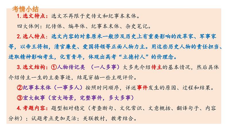 1.选文特点:选文不再限于史传文和纪事本末体。四大体例:纪传体、编年体、纪事本末体、杂史笔记。2.选人特点:选文内容的对象原米一般涉及历史上有重要影响的改革家、军事家等,以帝王将相,清官廉吏、爱国将领等正面人物力主。用这些历史人物的责任担当、进取精神影响考生,化育青年,体现出高考“立德村人”的价理念。3.选文结构:①人物传记类 (一人多事)大多先介绍传主的基本情况,然后具体介绍传主一生的主要事迹,结尾穿插一些主观评价。②纪事本末体(一事多人)按照时问顺序,详述事件发生的原因、过程和结果。 ③宏大叙事(宏大场景,完整事件,多大多事)4.考题内容:題型相对稳定(考查断句、文化常识、文意概括、翻译句子、内容分析);试題考点更加灵活;关联教村,教考结合。