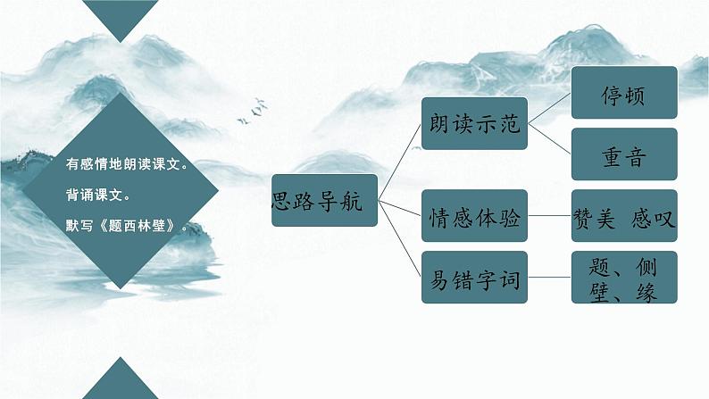 9 《古诗三首》课后题课件人教版四年级语文上册第三单元说说你对下列诗句的理解。◇不识庐山真面目,只缘身在此山中。◇梅须逊雪三分白,雪却输梅一段香。想象“一道残阳铺水中,半江瑟瑟半江红”的景象,用自己的话说一说。有感情地朗读课文。背诵课文。默写《题西林壁》。习题初览思路导航朗读示范停顿易错字词重音题、侧壁、缘1有感情地朗读课文。背诵课文。默写《题西林壁》。情感体验赞美 感叹题西林壁[宋]苏轼横看成岭侧成峰,远近高低各不同。不识庐山真面目,只缘身在此山中。有感情地朗读课文。背诵课文。默写《题西林壁》。想象“一道残阳铺水中,半江瑟瑟半江红”的景象,用自己的话说一说。2瑟瑟:原意为碧色珍宝,此处指碧绿色,诗中用来形容未受到残阳照射的江水所呈现的青绿色。思路导航景物难点词夕阳江水瑟瑟斜照江面半绿半红 夕阳的余辉洒在江面上,水面波光粼粼。江水受光多的一半呈现出深深的碧绿,受光少的一半呈现出殷红。两种颜色相映成趣,美轮美奂。想象“一道残阳铺水中,半江瑟瑟半江红”的景象,用自己的话说一说。说说你对下列诗句的理解。不识庐山真面目,只缘身在此山中。不识只缘深层含义:真面目此山中本义:我之所以看不清庐山的真实面目,是因为我身在庐山之中。诗人“不识庐山真面目”是因为“身在山中”,说明在山的某一局部反而不识真面目的道理。告诉我们,想要对某个事物有全面、符合实际的认识,就必须跳出局部,从整体上进行观察。当局者迷旁观者清说说你对下列诗句的理解。梅须逊雪三分白,雪却输梅一段香。梅雪深层含义:香白本义:梅花比不上雪花的晶莹洁白,雪花却输给梅花一缕清香。梅与雪各有所长,梅雪相映,清香与纯洁兼得,启示我们只有取长补短,才能达到最佳结果。各有所长取长补短