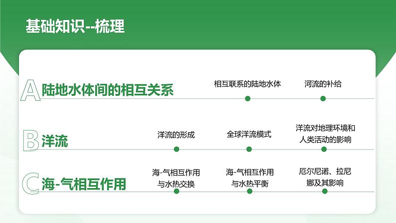 这是一份第四章 陆地水与洋流(串讲课件)-2024-2025学年高二地理上学期期中考点大串讲(湘教版2019选择性必修1),共53页。PPT课件主要包含了基础知识--梳理,重点难点--辨析,重点难点,思维拓展--提升等内容,欢迎下载使用。
