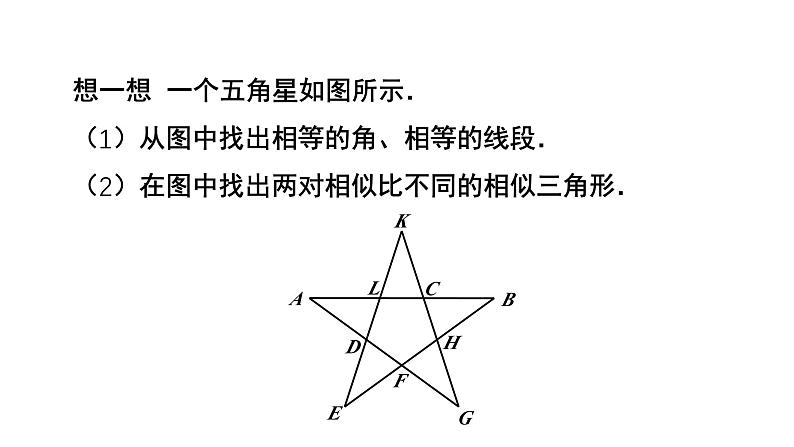 想一想 一个五角星如图所示.(1)从图中找出相等的角、相等的线段.(2)在图中找出两对相似比不同的相似三角形.