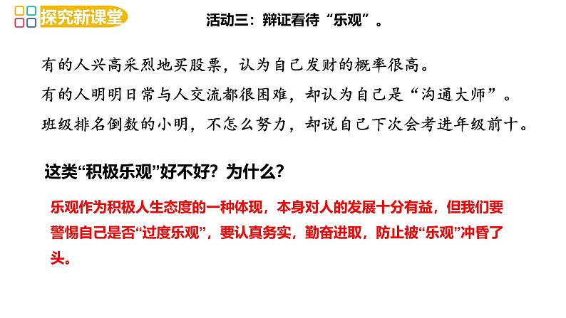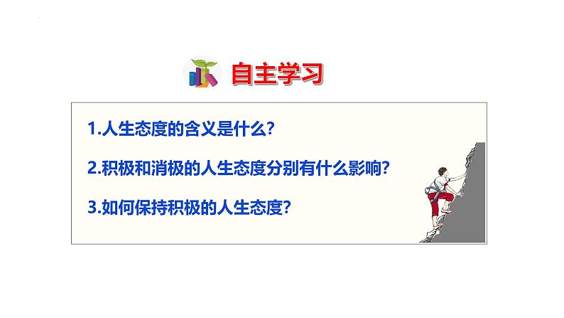 初中政治 (道德与法治)人教版(2024)七年级上册(2024)拥有积极的人生态度背景图课件ppt: 这是一份初中政治 (道德与法治)人教版(2024)七年级上册(2024)<a href="/zz/tb_c4049115_t3/?tag_id=26" target="_blank">拥有积极的人生态度背景图课件ppt</a>,共22页。PPT课件主要包含了判断选择,探究与分享等内容,欢迎下载使用。