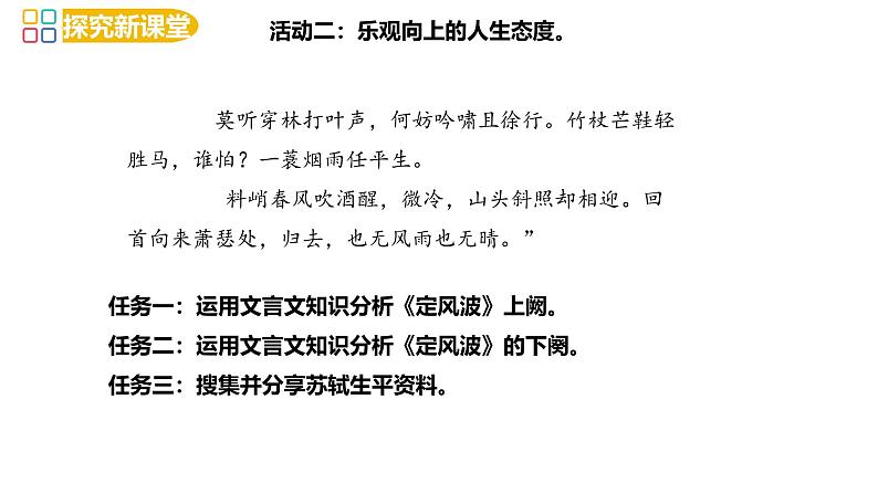 任务一:运用文言文知识分析《定风波》上阙。任务二:运用文言文知识分析《定风波》的下阕。任务三:搜集并分享苏轼生平资料。