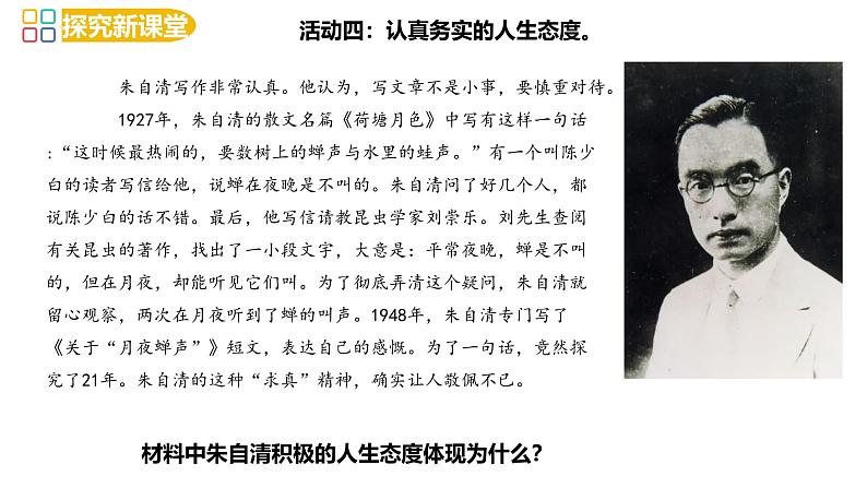 朱自清写作非常认真。他认为,写文章不是小事,要慎重对待。 1927年,朱自清的散文名篇《荷塘月色》中写有这样一句话:“这时候最热闹的,要数树上的蝉声与水里的蛙声。”有一个叫陈少白的读者写信给他,说蝉在夜晚是不叫的。朱自清问了好几个人,都说陈少白的话不错。最后,他写信请教昆虫学家刘崇乐。刘先生查阅有关昆虫的著作,找出了一小段文宇,大意是:平常夜晚,蝉是不叫的,但在月夜,却能听见它们叫。为了彻底弄清这个疑问,朱自清就留心观察,两次在月夜听到了蝉的叫声。1948年,朱自清专门写了《关于“月夜蝉声”》短文,表达自己的感慨。为了一句话,竟然探究了21年。朱自清的这种“求真”精神,确实让人敬佩不已。