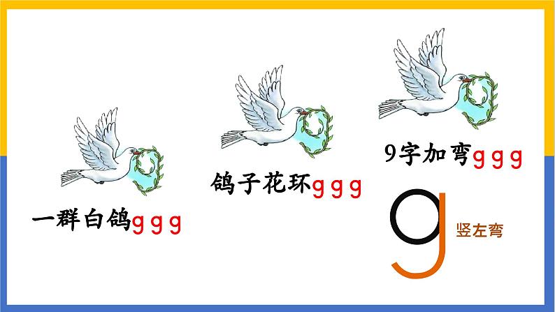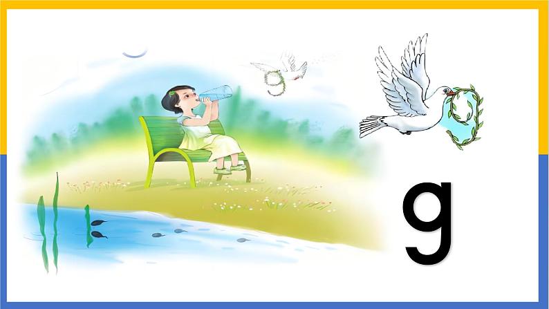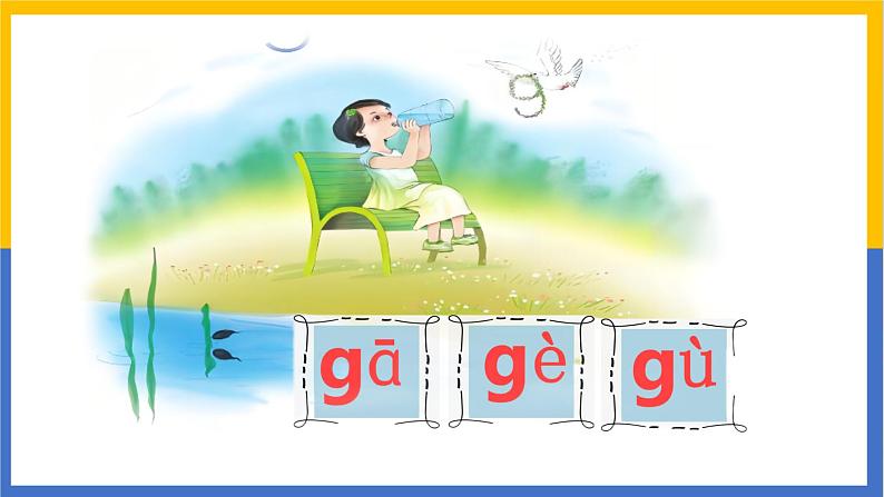 空中鸽(g)子飞,水里蝌(k)蚪游。小朋友,开心玩,咕咚咕咚把水喝(h)。