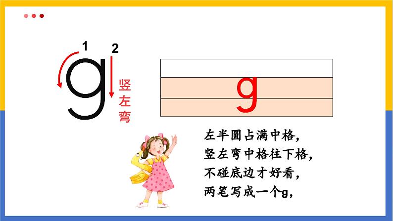 左半圆占满中格, 竖左弯中格往下格, 不碰底边才好看, 两笔写成一个ɡ,