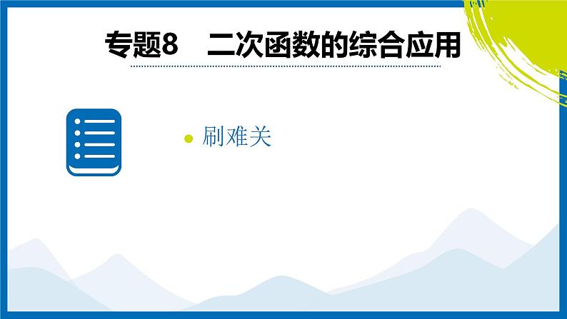 这是一份2025中考复习数学考点专题探究课件:专题8 二次函数的综合应用,共27页。PPT课件主要包含了专题8,刷难关,类型2交点问题,类型3整点问题,1求A点的坐标等内容,欢迎下载使用。