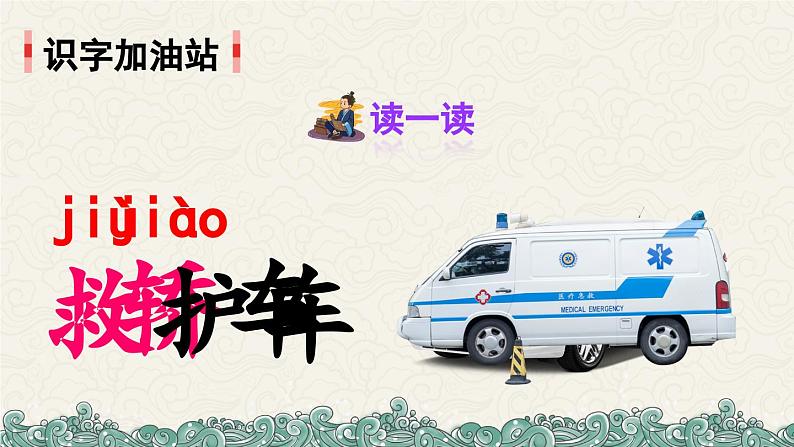 这是一份统编版(2024)二年级上册课文5语文园地六教课内容课件ppt,共14页。PPT课件主要包含了救护车,摩托车,消防车,科学考察船等内容,欢迎下载使用。
