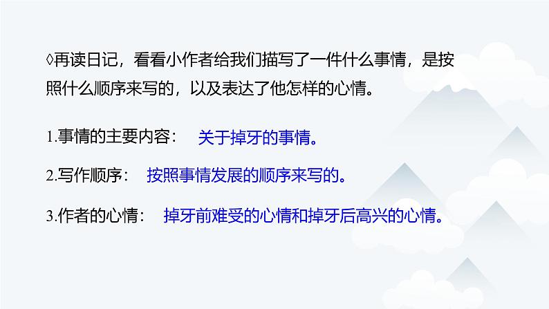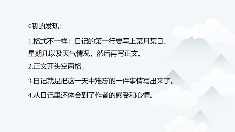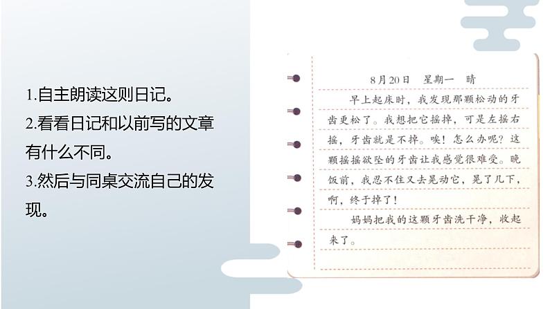 1.自主朗读这则日记。 2.看看日记和以前写的文章有什么不同。 3.然后与同桌交流自己的发现。