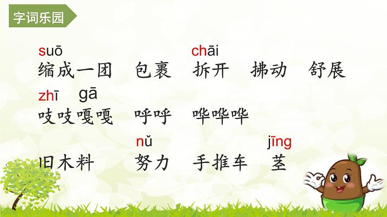 缩成一团 包裹 拆开 拂动 舒展吱吱嘎嘎 呼呼 哗哗哗旧木料 努力 手推车 茎