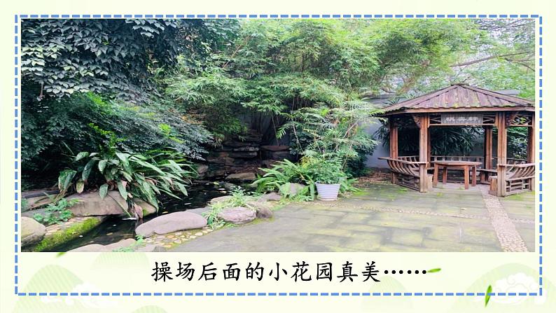 操场后面的小花园真美……秋天的树林就像一幅色彩斑斓的图画……一到池塘边,我就被眼前的景色吸引住了……