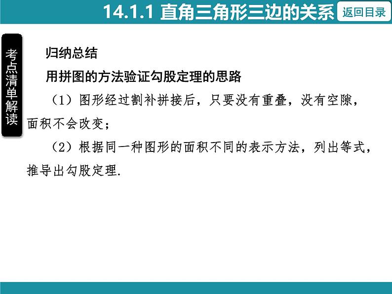 归纳总结用拼图的方法验证勾股定理的思路(1)图形经过割补拼接后,只要没有重叠,没有空隙,面积不会改变;(2)根据同一种图形的面积不同的表示方法,列出等式,推导出勾股定理.