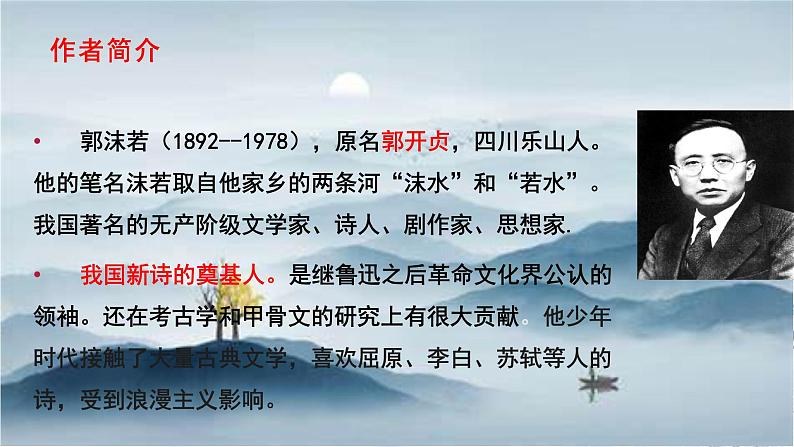 郭沫若(1892--1978),原名郭开贞,四川乐山人。他的笔名沫若取自他家乡的两条河“沫水”和“若水”。我国著名的无产阶级文学家、诗人、剧作家、思想家.我国新诗的奠基人。是继鲁迅之后革命文化界公认的领袖。还在考古学和甲骨文的研究上有很大贡献。他少年时代接触了大量古典文学,喜欢屈原、李白、苏轼等人的诗,受到浪漫主义影响。