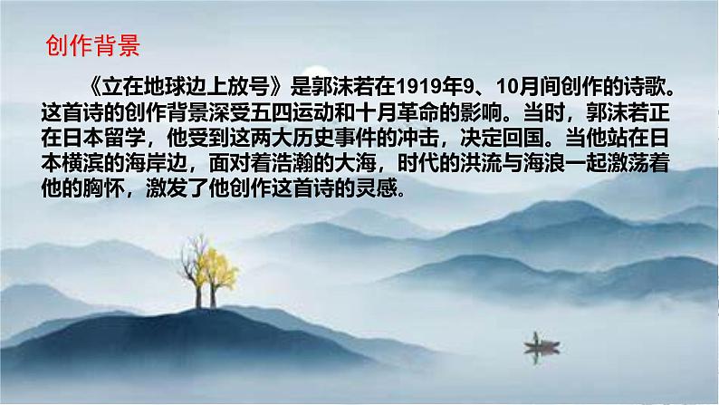 《立在地球边上放号》是郭沫若在1919年9、10月间创作的诗歌。这首诗的创作背景深受五四运动和十月革命的影响。当时,郭沫若正在日本留学,他受到这两大历史事件的冲击,决定回国。当他站在日本横滨的海岸边,面对着浩瀚的大海,时代的洪流与海浪一起激荡着他的胸怀,激发了他创作这首诗的灵感。