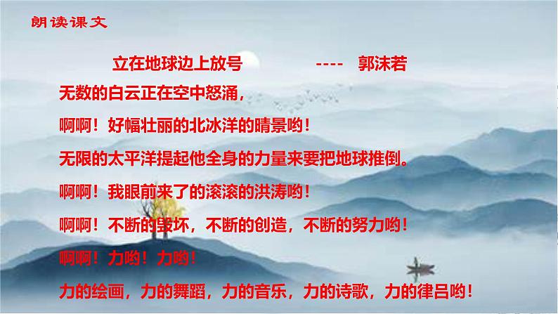 高中第一单元2 (立在地球边上放号 红烛 *峨日朵雪峰之侧 *致云雀)2.1 立在地球边上放号示范课ppt课件: 这是一份高中<a href="/yw/tb_c4001719_t3/?tag_id=26" target="_blank">第一单元2 (立在地球边上放号 红烛 *峨日朵雪峰之侧 *致云雀)2.1 立在地球边上放号示范课ppt课件</a>,共26页。PPT课件主要包含了导入新课,作者简介,写作背景,北冰洋-太平洋,诗歌赏析,诗歌内容,诗歌主题,郭沫若书法作品,拓展阅读等内容,欢迎下载使用。